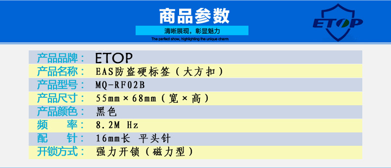 上一产品: 防盗磁扣 服装防盗扣\内衣店迷你\超市防盗标签\防盗磁扣 迷你 下一产品: ETOP超市防盗标签 eas红外系统服装彩色射频小方硬磁扣RF安防配件 返回