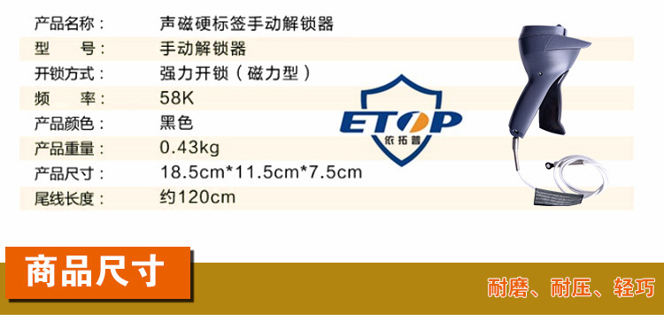 上一产品: ETOP 高尔夫取钉器 墨水扣HM服装防盗扣取钉器磁扣解扣器万能 下一产品: ETOP 强力取钉器 超市防盗扣取钉器 衣服防盗解锁器 防盗锁衣服 磁扣取钉器 返回