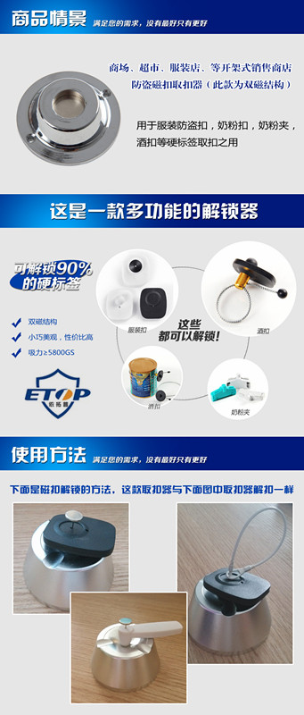 产品说明:商场、超市、服装店、等开架式销售商店,防盗磁扣取扣之用,此款为双磁结构,磁力较网上销售其他便宜的单磁取扣器强,本店不销售那类取扣器。